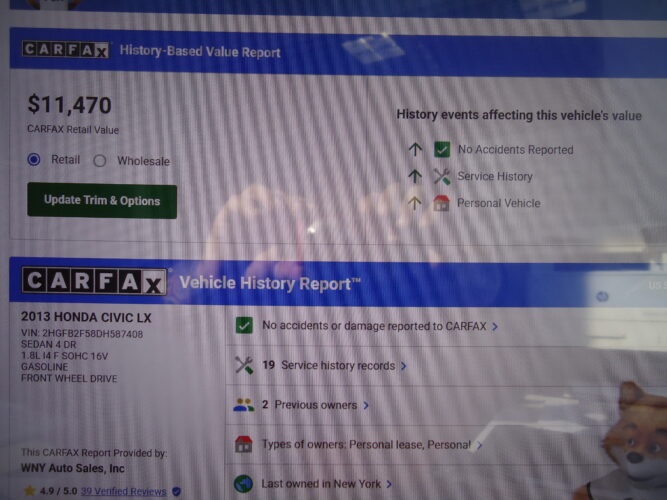 This 2013 Civic is an extra clean sedan with 95k miles. In the shop, we just serviced this one with a full synthetic oil change, new Interstate battery and new front brakes/rotors. The Civic comes with nice options listed below and is detailed and ready to go. Every vehicle we sell at WNY Auto Sales & Service comes with a clean CARFAX report and a 12 month/18,000 mile warranty package. We have financing available for good or bad credit and we welcome any trade-in. Call Mark at 716-857-0145. ***We can issue new plates and do transfers right here at the dealership***