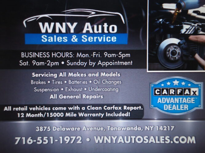 Full Service Repair Shop NOW OPEN!!! Servicing all makes and models. We can assure you that you won’t find better work at a better price than at WNY Auto Sales & Service. We feature: PennGrade oil products, Interstate batteries, Michelin, Goodyear, Yokohama & Continental tires and are able to service your vehicle quickly and with a smile. Call 716-551-1972 and ask for Dominic or Mark to schedule an appointment today.