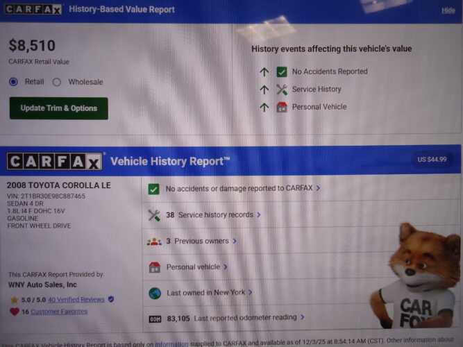 This 2008 Corolla is an extra clean sedan with only 83k miles. In the shop, we just gave this one a full synthetic oil change and 4 brand new tires. This Toyota was very well maintained and is extra clean inside, outside and underneath. If you are looking for a reliable, dependable daily car, come see this one. Every vehicle we sell at WNY Auto Sales & Service comes with a clean CARFAX report and a 12 month/18,000 mile warranty package. We have financing available for good or bad credit and we welcome any trade-in. Call Mark at 716-857-0145. ***We can issue new plates and do transfers right here at the dealership***